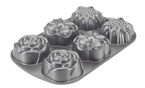 | 21 of 21 people found the following review helpful: By This review is from: Nordic Ware Bouquet Pan (Kitchen) Okay, I admit it, I own many different styles of these pans -- I am attracted to the various designs and high quality. Initially I was surprised at the price tag but as is often the case, you get what you pay for. Properly cared for, this pan will last a lifetime. The pan is particularly lovely because of the three different flowers -- rose, sunflower and daisy. Pan preparation is important so don't skip this step. Spray Baker's Joy (cooking spray that contains flour and is designed for baking) liberally in the pan to capture all details, then turn the pan upside down over paper towels to drain while you prepare the batter. The recipe that comes with the pan is delicious but a cake mix may be altered to work well in the pan. A dense cake, like a pound cake is the goal. There are many recipes on the internet recipe/cooking sites. In a search engine type in the words -- recipe for bundt cake from mix. A typical alteration includes an additional egg and substituing yogurt... Read more 7 of 7 people found the following review helpful: By Amazon Verified Purchase This review is from: Nordic Ware Bouquet Pan (Kitchen) These are heavy-duty cast aluminum pans. The pan is very heavy and has a non-stick finish, six cavities in three different flower shapes: rose, daisy and sunflower. Each cavity has a 1 cup capacity. I have had good results by filling with 1/2 C of batter. As it bakes, the batter will rise and fill the remaining space in the cavity. If you overfill, the bottoms will rise up and be rounded so they won't sit level(though you can also use a cake leveler to trim the bottoms flat to the pan before turning the cakes out- they sell these but I use a very fine gauge stainless steel wire which has each end wrapped around a 3-inch wooden dowel). I have several styles of these pans- love Nordic Ware cast pans. They will last forever if properly cared for and is an easy way to take your baking up a notch without really having to do anything special. I have used cake, cupcake, quick bread and muffin recipes in these pans. I have never had anything stick... Read more 5 of 5 people found the following review helpful: By NTT "NTT" (Houston, TX, USA) - See all my reviews Amazon Verified Purchase This review is from: Nordic Ware Bouquet Pan (Kitchen) Nordic Ware baking pans are very pretty and of high quality. I own quite a few pieces by Nordic Ware. The first one was an accident buy and became hooked with this brand. For the pans that have designs such as this one, I use a brush for easy cleaning. I don't use them just for baking but for gelatin molds, ice molds, and a variety of food that can be mold into these beautiful designs pans. |